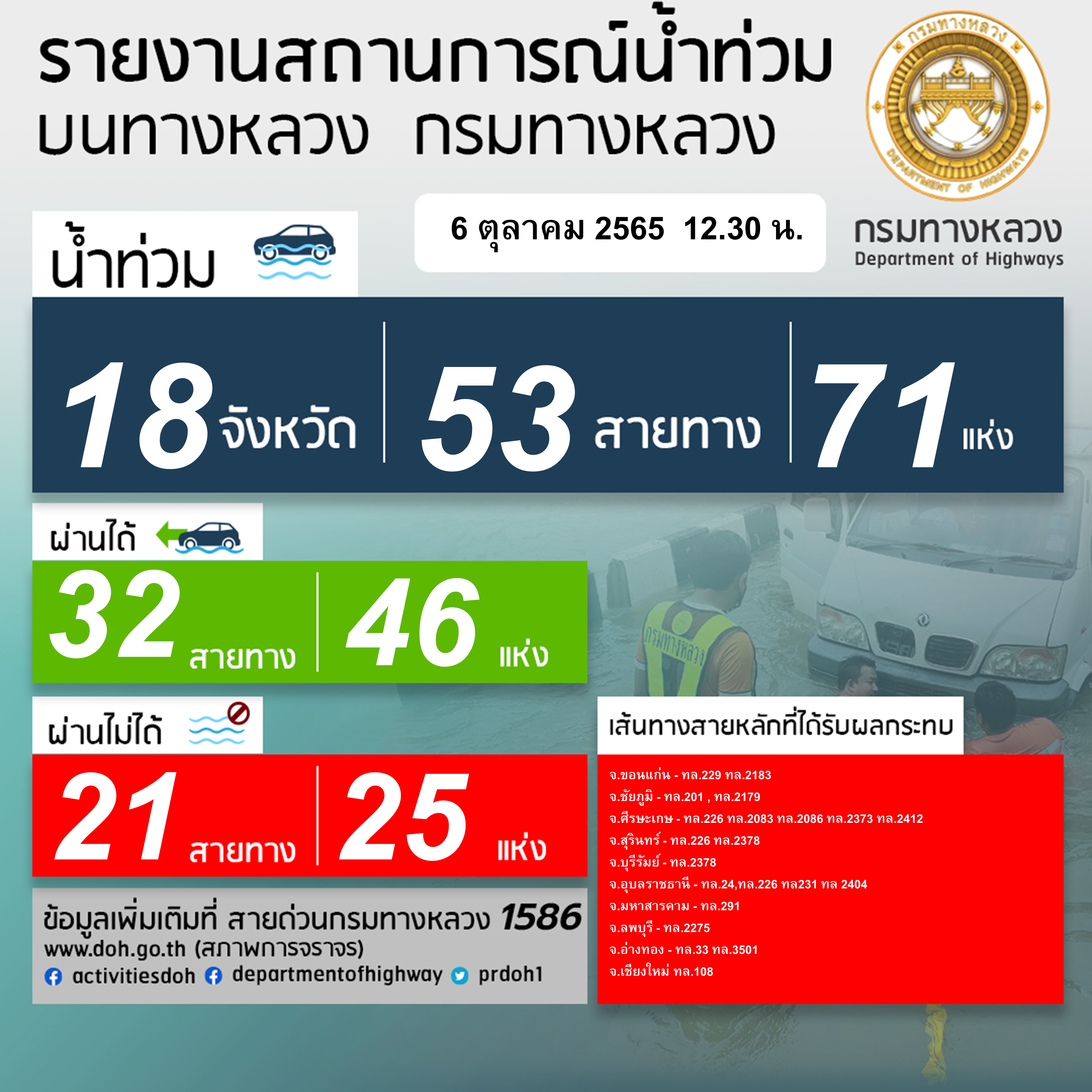 กรมทางหลวงร่วมบูรณาการกับหน่วยงานที่เกี่ยวข้องในการลงพื้นที่ เพื่อช่วยเหลือประชาชน พร้อมเร่งระบายน้ำบำรุงรักษาเส้นทางที่ได้รับผลกระทบ ในขณะที่บางพื้นที่ก็มีการล้างทำความสะอาดถนน ทางลอดใต้สะพานหลังจากน้ำลดลงบ้างแล้ว เพื่อบรรเทาความเดือดร้อนของประชาชนให้ได้รับความสะดวกปลอดภัยในการสัญจรโดยเร็วที่สุดอย่างต่อเนื่อง 24 ชั่วโมง ตามข้อสั่งการของ นายศักดิ์สยาม ชิดชอบ รมว.คมนาคม ที่มีความห่วงใย จากสถานการณ์ฝนตกหนักในหลายพื้นที่ ที่ได้รับผลกระทบจากพายุไต้ฝุ่น “โนรู” พร้อมทั้งเฝ้าระวังตลอด 24 ชั่วโมง เพื่อช่วยประชาชนอย่างทันท่วงที พร้อมกันนี้กรมทางหลวง ได้ทำการสรุปสถานการณ์อุทกภัยและดินสไลด์บนทางหลวง โดยสถานการณ์ประจำวันที่ 6 ตุลาคม 2565 เวลา 15.00 น. พบทางหลวงถูกน้ำท่วม/ดินสไลด์ในพื้นที่ 18 จังหวัด ได้แก่ จ.เลย, จ.ศรีสะเกษ, จ.สุรินทร์, จ.บุรีรัมย์, จ.นครราชสีมา, จ.ขอนแก่น, จ.มหาสารคาม, จ.ชัยภูมิ, จ.อุบลราชธานี, จ.หนองบัวลำภู, จ.ร้อยเอ็ด, จ.ลพบุรี, จ.อ่างทอง, จ.พระนครศรีอยุธยา, จ.สิงห์บุรี, จ.ปราจีนบุรี, จ.นครสวรรค์ และ จ.เชียงใหม่ จำนวน 53 สายทาง จำนวน 71 แห่ง ทางหลวงที่การจราจรผ่านได้ 46 แห่ง การจราจรผ่านไม่ได้ 25 แห่ง ในพื้นที่ 9 จังหวัด โดยทุกจุดมีเจ้าหน้าที่คอยอำนวยความสะดวกด้านการจราจร รายละเอียดดังนี้