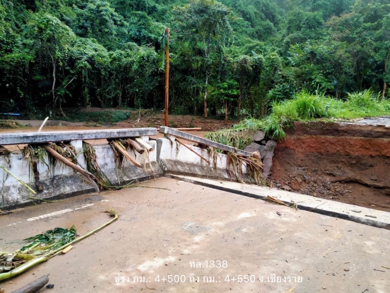 1.จังหวัดเชียงราย จำนวน 1 แห่ง บนทางหลวงหมายเลข 1338 ตอนขาแหย่ง - ป่าเหมี่ยง ในพื้นที่ อ.แม่ฟ้าหลวง ช่วง กม.ที่ 4+500 – 4+550 ระดับน้ำสูง 40 ซม. ฝนตกหนักต่อเนื่องทำให้สะพานขาด ให้ใช้ทางเลี่ยง ทล.1130 และเส้นทางบ้านห้วยส้าน – บ้านป่าเหมี่ยง คาดว่าผ่านได้วันที่ 10 ต.ค. 65