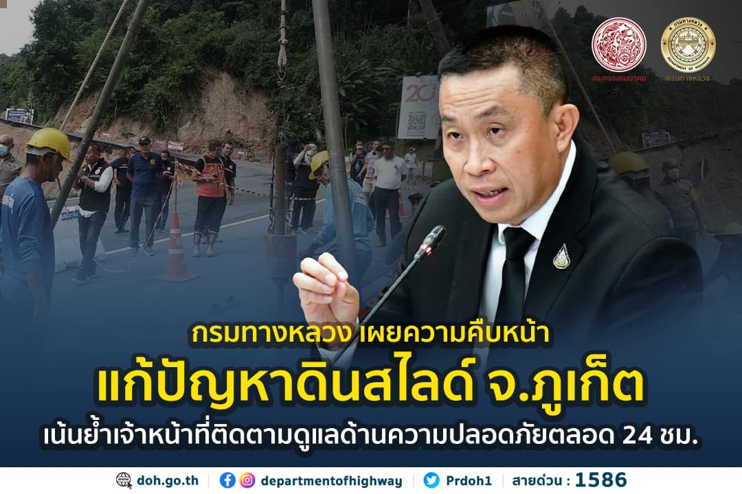 นายสราวุธ ทรงศิวิไล อธิบดีกรมทางหลวง เปิดเผยถึง แนวทางการแก้ไขปัญหาและซ่อมแซมทางหลวงที่ได้รับความเสียหายจากผลกระทบจากภาวะฝนตกหนักจนเกิดเป็นดินสไลด์หลายแห่งในจังหวัดภูเก็ต ตามข้อสั่งการของนายศักดิ์สยาม ชิดชอบ รัฐมนตรีว่าการกระทรวงคมนาคม มอบหมายให้ทุกหน่วยงานในสังกัดกระทรวงคมนาคม เร่งบรรเทาทุกข์ประชาชนผู้ประสบปัญหาภัยพิบัติทุกกรณีอย่างเร่งด่วน ทั้งทางด้านการเข้าแก้ไขเหตุและการอำนวยความสะดวกความปลอดภัย