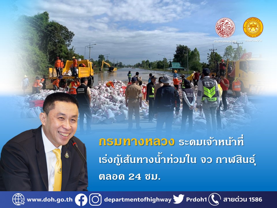 นายสราวุธ ทรงศิวิไล อธิบดีกรมทางหลวง เปิดเผยว่า จากสถานการณ์น้ำท่วมบนทางหลวงในหลายจังหวัดโดยเฉพาะภาคตะวันออกเฉียงเหนือที่ระดับน้ำยังคงทรงตัว ส่งผลกระทบให้ประชาชนในพื้นที่และรอบๆ ได้รับความเดือดร้อน กรมทางหลวงโดย แขวงทางหลวงกาฬสินธุ์ บูรณาการหน่วยงานในพื้นที่ดำเนินการระดมกำลังเจ้าหน้าที่กู้เส้นทาง โดยกั้นน้ำด้วยการวางกระสอบทราย สูบนำ้ออกจากผิวจราจร เพื่อเปิดการจราจรให้เร็วที่สุด และจัดเจ้าหน้าที่อำนวยความสะดวกประชาชนตลอด 24 ชั่วโมง บนทางหลวงหมายเลข? 214 สาย กาฬสินธุ์ – ร้อยเอ็ด ระหว่าง กม.24+400 - กม.27+800 ช่วงจากบ้านหัวแฮดถึงสี่แยกไฟแดง บ้านท่ากลาง, บ้านท่าเพลิง อำเภอกมลาไสย จังหวัดกาฬสินธุ์ ซึ่งที่ผ่านมากรมทางหลวงได้ให้ความช่วยเหลือทั้งกรณีเร่งด่วนและต่อเนื่องตามสถานการณ์ โดยดำเนินการตามนโยบาย นายศักดิ์สยาม ชิดชอบ รัฐมนตรีว่าการกระทรวงคมนาคม ที่ให้ความสำคัญในการช่วยเหลือผู้ประสบอุทกภัย พร้อมแสดงความห่วงใยและส่งกำลังใจถึงประชาชนในพื้นที่ให้สามารถผ่านวิกฤตการณ์ดังกล่าวไปได้โดยเร็ว